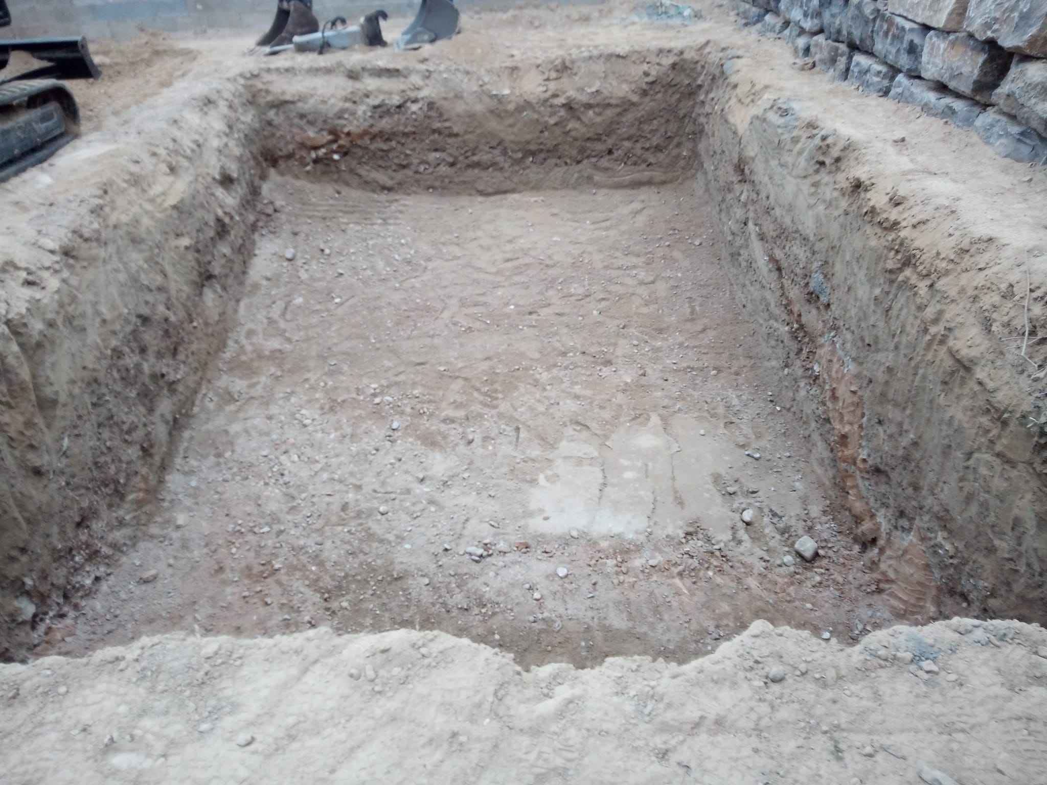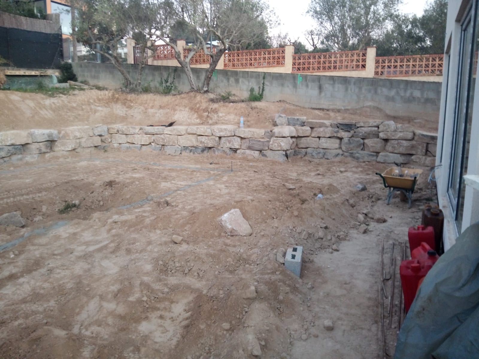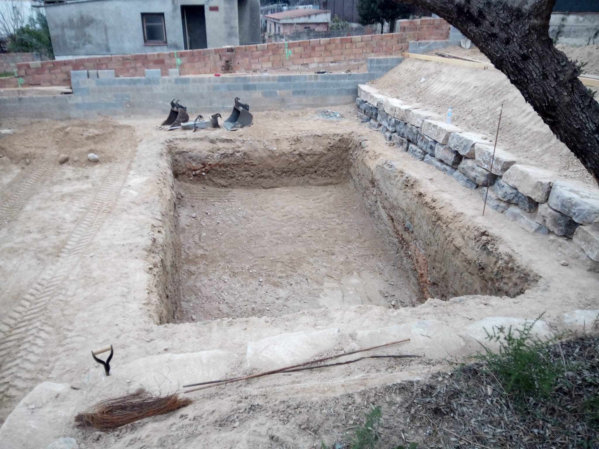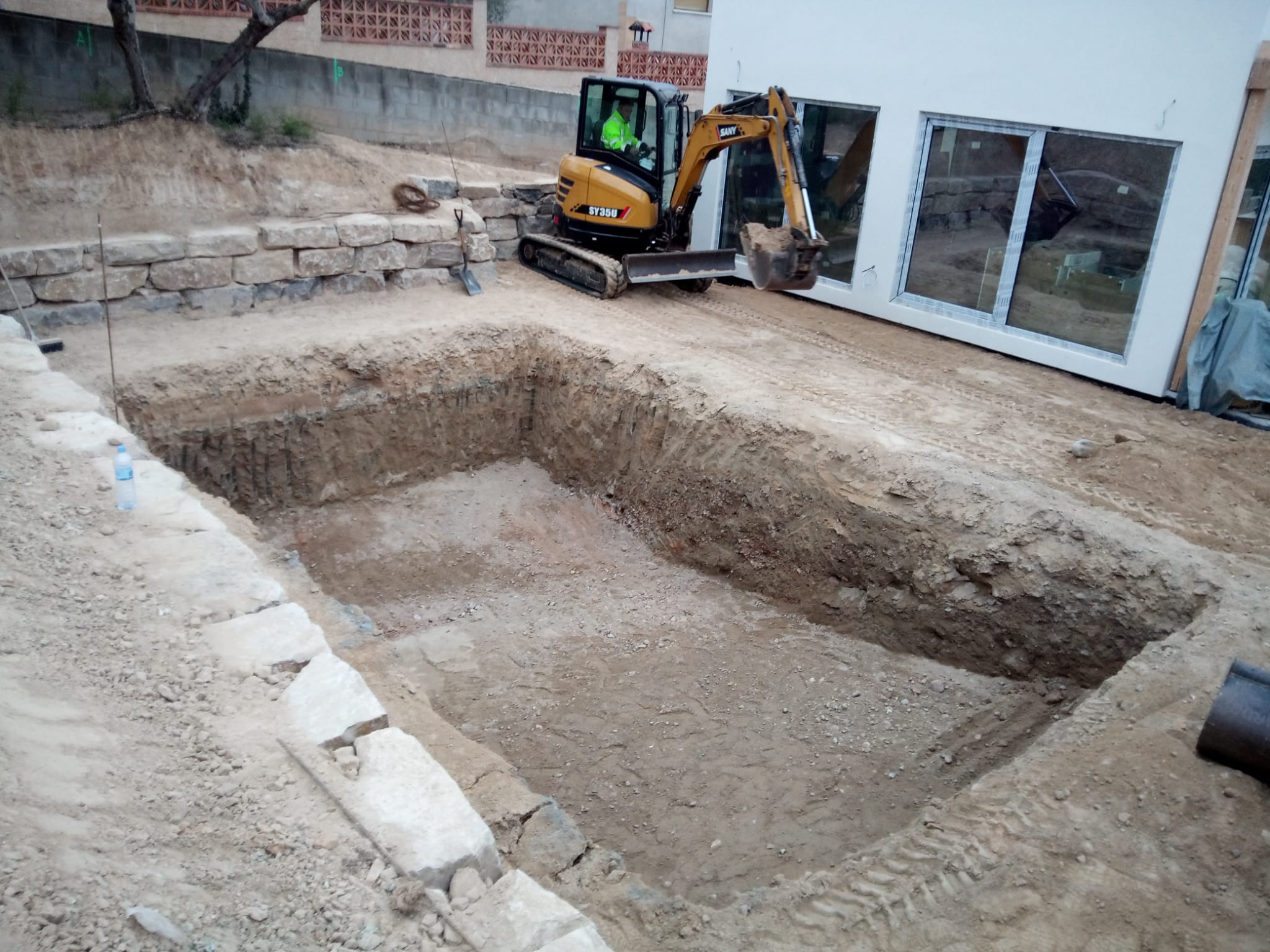 Excavación de piscina con muro de rocalla