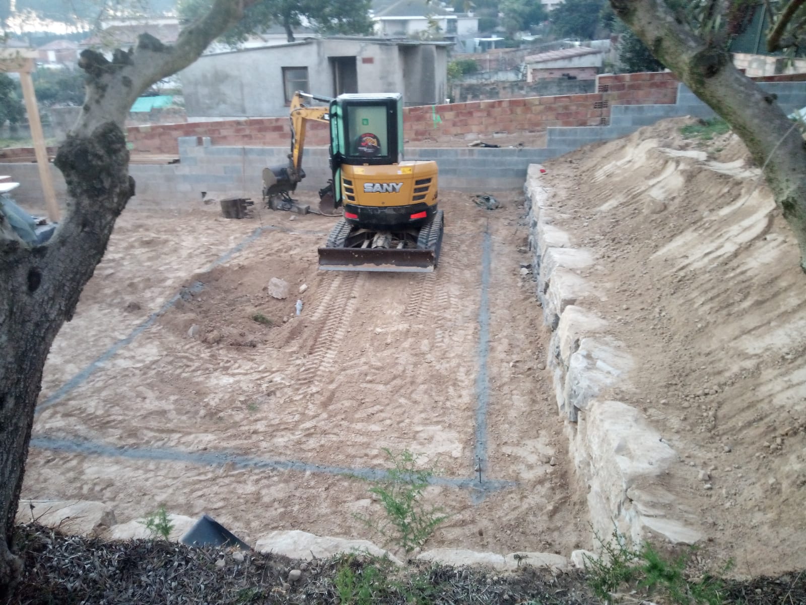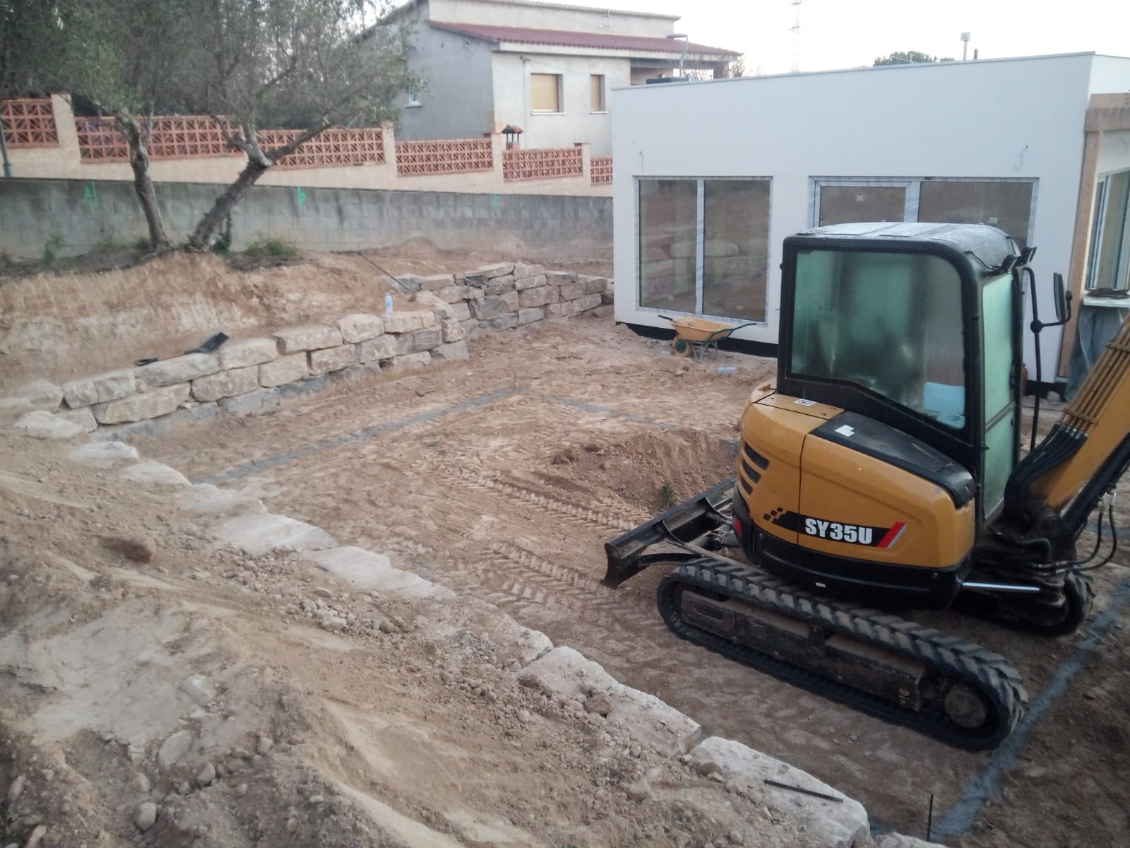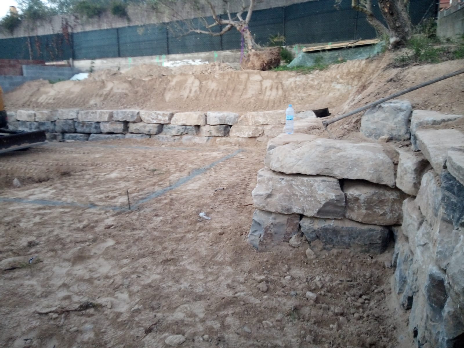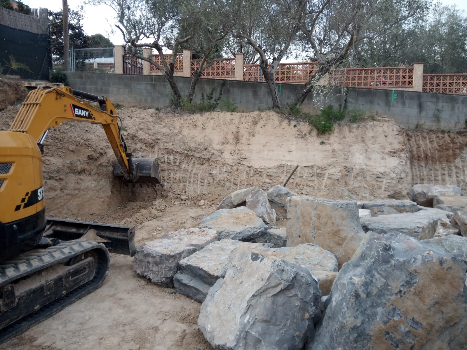 Excavación de piscina con muro de rocalla